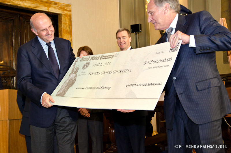 Roma, 1 aprile 2014 – Consegnato questa mattina un assegno simbolico di 1.500.000 dollari, al capo della Polizia, il Prefetto Alessandro Pansa dall’Ambasciatore americano John R. Phillips presso la sede dell’ambasciata USA. La somma è il risultato del sequestro di proventi illeciti di un’operazione congiunta tra la DEA (Drug Enforcement Administration) e la Polizia di Stato italiana.
