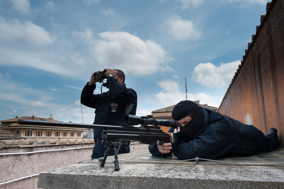 Tiratori scelti appostati nell’area Vaticana, pattugliamenti con la Polizia cinofila lungo l’area di massima sicurezza e bonifiche del letto dei fiumi Tevere e Aniene a cura della Squadra nautica fluviale della Questura di Roma.