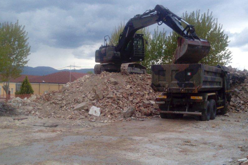 Le operazioni di demolizione di altri fabbricati e lo smaltimento del materiale di risulta, che ammonta a circa 10.000 metri cubi, continueranno fino a metà di giugno e vedranno impegnati un’unità lavori composta da 16 militari, 2 escavatori per la demolizione, 1 pala caricatrice, 6 mezzi pesanti per il trasporto macerie ed attrezzature varie del genio.