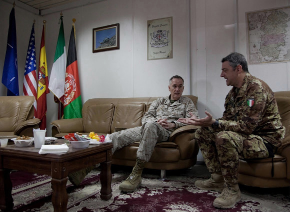 Herat (Afghanistan) 15 maggio 2014 – Il generale statunitense Joseph F. Dunford, comandante delle forze NATO in Afghanistan, si è recato due giorni fa a Herat dove ha incontrato il personale del Regional Command West, il comando multinazionale a guida italiana su base Brigata Sassari che dal febbraio scorso è responsabile delle operazioni militari nella regione occidentale dell’Afghanistan.