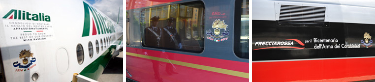 Roma, 5 giugno 2014 – Da ieri e per tutto il periodo estivo, il logo celebrativo del Bicentenario dell’Arma dei Carabinieri sarà visibile sulla “flotta AZ” dell’Alitalia, su circa 130 vettori aerei impiegati sulle tratte di medio e lungo raggio. Sarà visibile inoltre su alcune carrozze passeggeri dei treni “Italo” di NTV e “Frecciarossa” di Trenitalia, e all’interno delle 12 “Case Italo” e sul portale di bordo “Italolive”.
