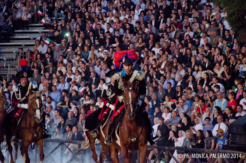 Roma, 8 giugno 2014 – Circa diecimila erano gli spettatori presenti il 5 giugno, a piazza di Siena per assistere allo spettacolo equestre in occasione della celebrazione del Bicentenario dell’Arma dei Carabinieri. La manifestazione è stata aperta con l’entrata in campo della banda musicale dei carabinieri a piedi e poi a cavallo, comandata dal maresciallo lt. Fabio Tassinari.