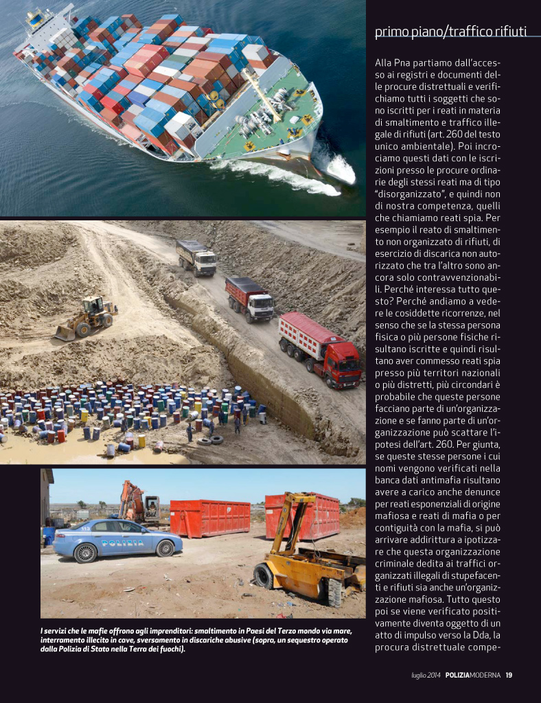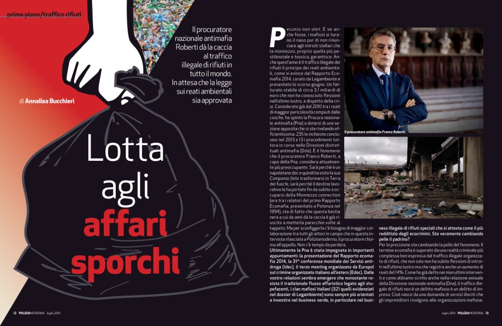 Roma, 14 luglio 2014 – Oggi in edicola la rivista Poliziamoderna di luglio. Tra gli articoli segnaliamo l’intervista al procuratore nazionale antimafia Franco Roberti sul traffico illecito di rifiuti.