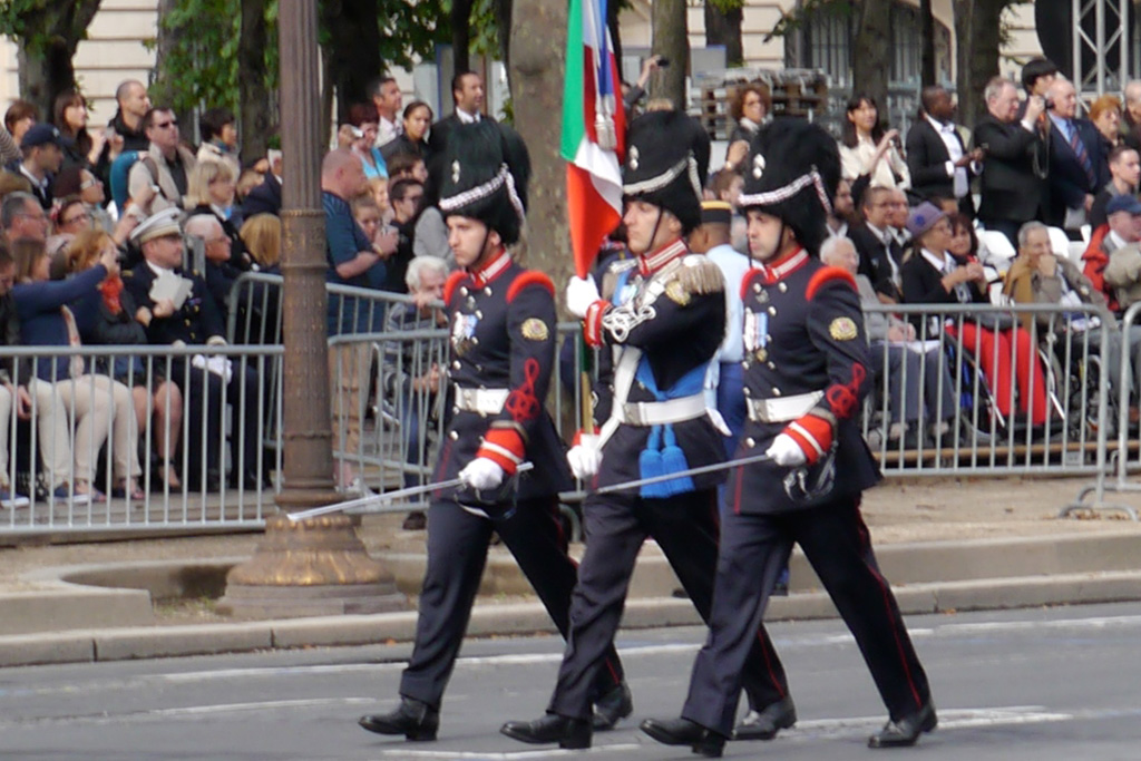 Parigi, 18 luglio 2014 – Lunedì scorso, in occasione della celebrazione della Presa della Bastiglia, militari francesi e di altre 70 nazioni hanno partecipato alla parata del 14 luglio. Sui Champs-Élysées per l’Italia ha sfilato una rappresentanza della brigata Granatieri di Sardegna, con la bandiera di guerra indossando l’uniforme storica del 1848, i cui alamari sono le mostreggiature più antiche delle forze armate italiane.