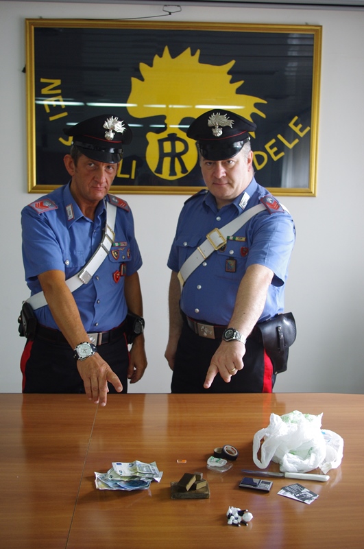 Il ragazzo, durante la perquisizione domiciliare operata con l’ausilio di un’unità cinofila, è stato trovato in possesso di 9 gr. di stupefacente del tipo cocaina già suddivisi in singole dosi e grammi, 134 gr. di hashish suddivisi in quattro involucri, di un bilancino di precisione, di materiale vario per confezionamento e la somma in contante di € 105,00 ritenuta provento dell’attività illecita. Il tutto è stato sequestrato dai militari (foto).