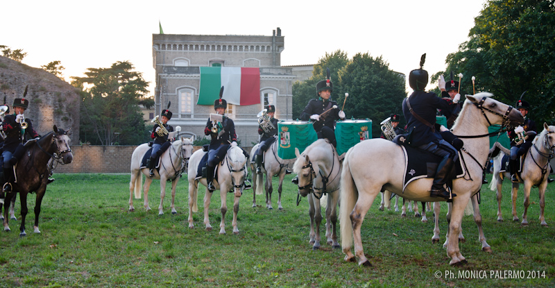 Roma, 24 luglio 2014 – Grande pubblico e forti emozioni, ieri sera a Santa Croce Effetto Notte 2014. La serata, presentata dal colonnello Jean Marie Moyersoen e dalla presentatrice Silvia Roberto, è iniziata con l’esibizione della fanfara a cavallo del reggimento Lancieri di Montebello (8°), comandata dal capofanfara il sergente maggiore Salvatore Pinci. Il concerto è iniziato con la Marcia d’ordinanza del Reggimento Lancieri di Montebello (8°), per poi proseguire con le marce di ordinanza degli altri reggimenti: Cavalleggeri di Monferrato (13°) e Savoia Cavalleria (3°). La fanfara ha poi suonato altri famosi brani come La bella Gigogin, Il soldato innamorato, Il monte Grappa, Il Piave, l’Inno nazionale, e a conclusione si è esibita in “Marcia del principe Eugenio”, la Marcia di ordinanza dell’Arma di cavalleria. Al termine del concerto è stata data al capofanfara una targa celebrativa di Santa Croce Effetto Notte 2014.