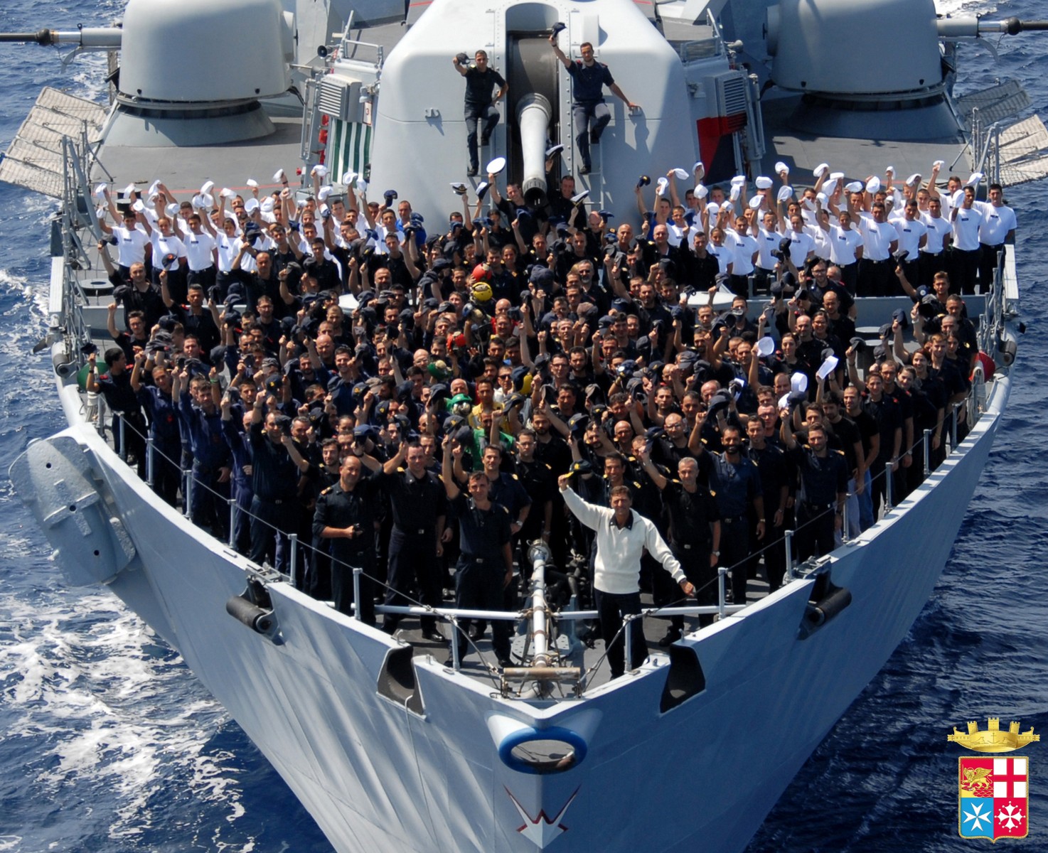 Rappresentanza dell’equipaggio e del Reparto Accademia Navale schierata a prora