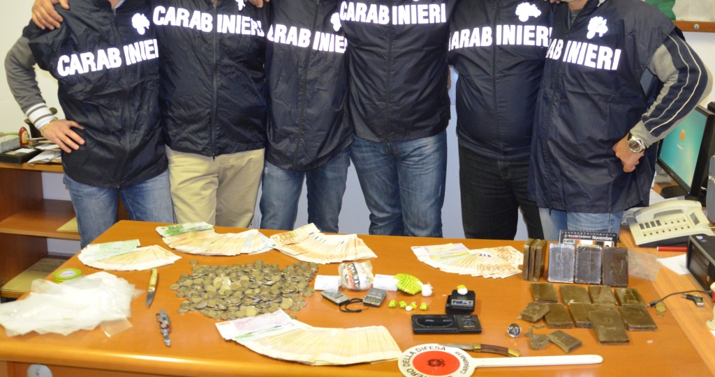 Nell’appartamento sono stati rinvenuti circa 2 chili di hashish e circa 200 grammi di cocaina, il tutto contornato da 4 bilancini di precisione, un ingente quantitativo di materiale da taglio e per il confezionamento nonché 33.500,00 euro in contanti provento di precedente spaccio.
