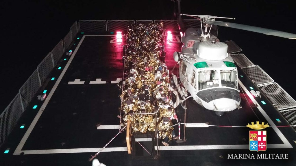 Roma, 17 gennaio 2015 – Il pattugliatore della Marina Militare Libra inserito nel dispositivo di Frontex “Triton” ha soccorso la scorsa notte, a 60 miglia nautiche dalle coste di Tripoli, due imbarcazioni con numerosi migranti a bordo. I due eventi SAR, condotti ed ultimati durante la notte, hanno portato al recupero da imbarcazioni in difficoltà di 111 e 175 migranti.