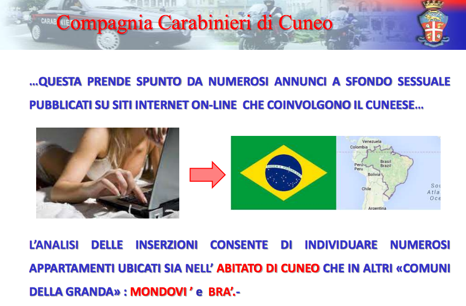 Cuneo, 23 gennaio 2015 – È stata portata a termine, nei giorni scorsi, dai Carabinieri della Compagnia di Cuneo una mirata attività d’indagine, durata sette mesi, da cui è emerso un fiorente giro di prostituzione, che aveva come base principale un’abitazione ubicata in pieno centro cittadino, ben organizzato e che ha interessato l’intera provincia di Cuneo. L’operazione è stata denominata Brasil 2 in quanto è la prosecuzione di un’altra indagine analoga conclusasi lo scorso anno.
