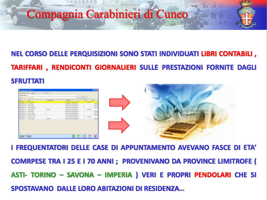 Della redditizia attività di prostituzione facevano parte una decina tra donne ed uomini, tutti giovani sudamericani, tenuto da una donna brasiliana di 53 anni, raggiunta da un ordine di custodia cautelare in carcere emesso dal G.I.P. del Tribunale di Cuneo, su richiesta del P.M. dr.ssa Chiara Canepa che ha coordinato le indagini, ed una coppia, lui italiano 59enne e lei sudamericana 35enne, indagati a piede libero, per i reati di favoreggiamento e sfruttamento aggravato della prostituzione.