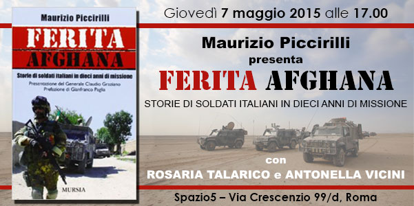 ferita afghanaRoma, 4 maggio 2015 – Giovedì 7 maggio 2015 alle 17.00, presso Spazio5 in via Crescenzio 99/d a Roma, il giornalista Maurizio Piccirilli presenterà il volume Ferita afghana. Storie di soldati italiani in dieci anni di missione (Edizioni Mursia) con Rosaria Talarico e Antonella Vicini.