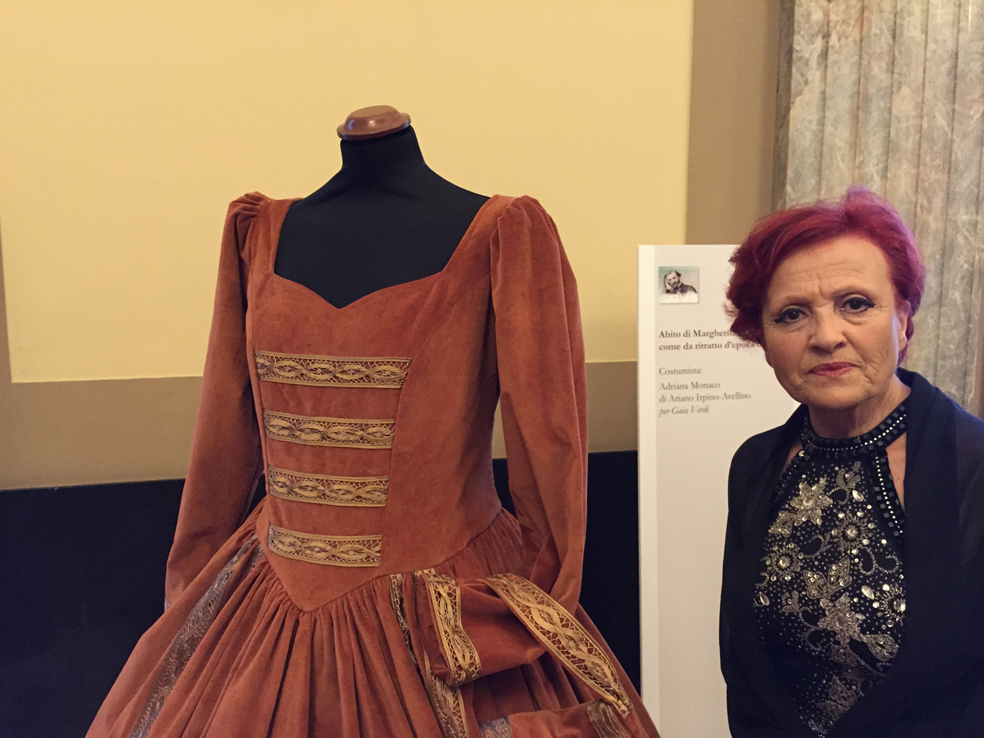 Roma, 12 giugno 2015 – Nella splendida cornice di Palazzo Aeronautica, a Roma, sede istituzionale dell’Aeronautica Militare, vengono messi in mostra cimeli storici di Giuseppe Verdi, e tre abiti storici riprodotti dalla stilista campana Adriana Monaco. Per la prima volta nella storia, Adriana Monaco ha riprodotto, nel suo laboratorio di Ariano Irpino, l’abito che indossa Margherita Barezzi, prima moglie di Giuseppe Verdi, in uno storico ritratto di Augusto Mussini del 1840. Velluto color aragosta, pizzo delicato, merletti, una piccola borsa da polso. Riprodotto anche un abito in seta e pizzo rosa di Violetta, ispirato da Maria Callas, ed un costume in velluto verde e lana rossa del Duca di Mantova dal Rigoletto. La costumista, con l’etichetta Villa Cesarina by Adriana Monaco, si è specializzata nella realizzazione di abiti storici e fantasy, e promuove la cultura attraverso il Gruppo di danza “Gruppo Campano Adriana Monaco S.D.C.I.” spostandosi in Italia e nel mondo.