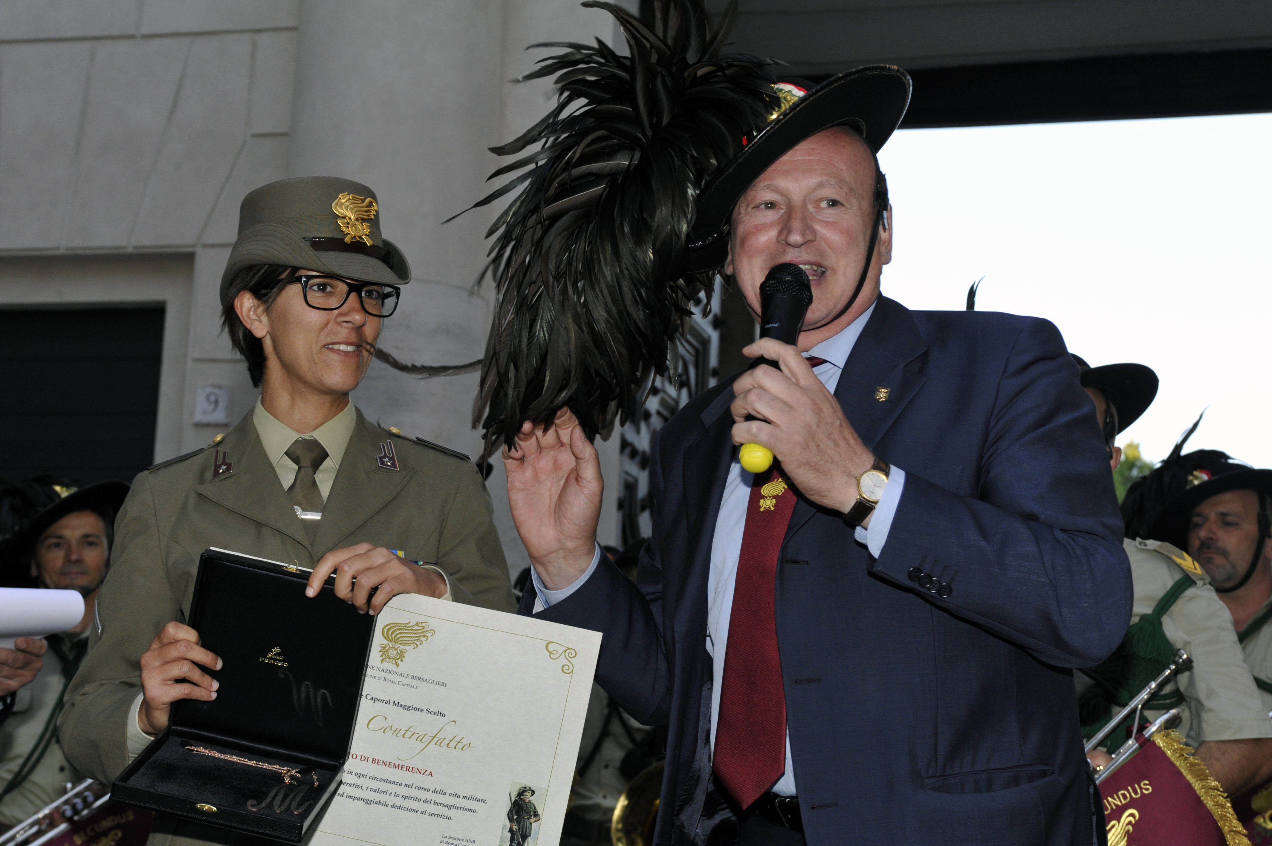 Molta emozione per la consegna di un attestato di benemerenza della Sezione di Roma Capitale dell’Associazione Nazionale Bersaglieri al caporale maggiore scelto Monica Contraffatto, gravemente ferita in Afghanistan e prima donna dell’Esercito Italiano ad essere stata decorata con la Medaglia d’Oro al Valore dell’Esercito.