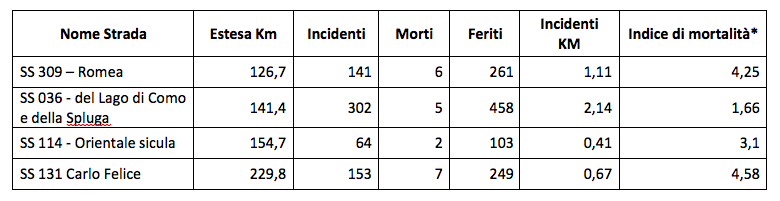 Per i prossimi due mesi lungo la SS 36 “del Lago di Como e dello Spluga”, SS 309 “Romea”, SS 131 “Carlo Felice” e la SS 114 “Orientale Sicula”, l’Arma dei Carabinieri intensificherà i controlli soprattutto nelle ore notturne e nei fine settimana, con particolare attenzione allo stato di ebbrezza dei conducenti che verrà verificato grazie ad appositi dispositivi donati dalla Fondazione ANIA. La scelta di intervenire sulle strade statali italiane si lega al fatto che, nell’ultimo anno, queste tratte hanno fatto registrare oltre 31 morti a settimana, per un totale di 1643 decessi, pari al 48,5% del totale dei morti per incidente stradale in Italia. In questo quadro, sono state scelte 4 tra le arterie più pericolose d’Italia per numero di incidenti e morti (vedi tabella in basso).