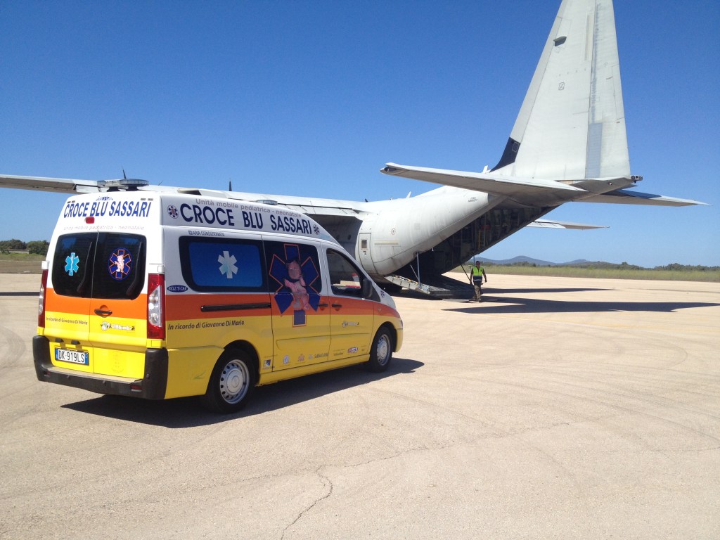 Il velivolo è giunto all’aeroporto militare di Alghero poco prima delle 15.00 ed ha caricato al suo interno l’ambulanza pediatrica della “Croce Blu” di Sassari con a bordo la piccola paziente e  un’équipe medica.