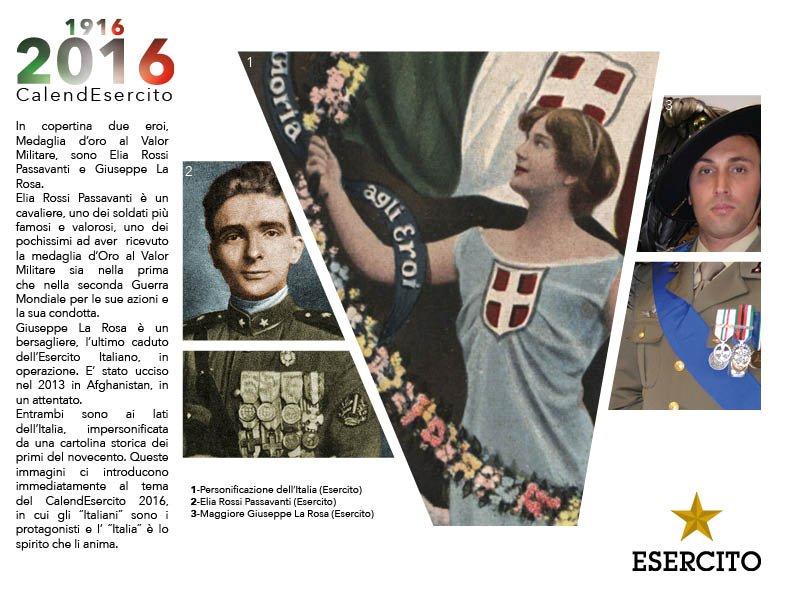 Un Esercito sempre più impegnato in Patria e nel mondo, un Esercito professionale di uomini e donne che condividono oggi gli stessi valori, gli stessi sentimenti degli italiani che combatterono per l’unità del Paese. Nel CalendEsercito 2016 sono presenti non solo eroi militari ma anche eroi della quotidianità nati nel 1916 (pagina centrale con Arnoldo Foà, Raf Vallone, Giorgio Bassani, Ferruccio Lamborghini, Ondina Valla, Luigi Comencini, Natalia Ginzburg, Paolo Budinich, Aldo Moro, Marcello Morante, Ugo Mursia e Dino Risi) e che hanno contribuito negli anni alla crescita del Paese.
