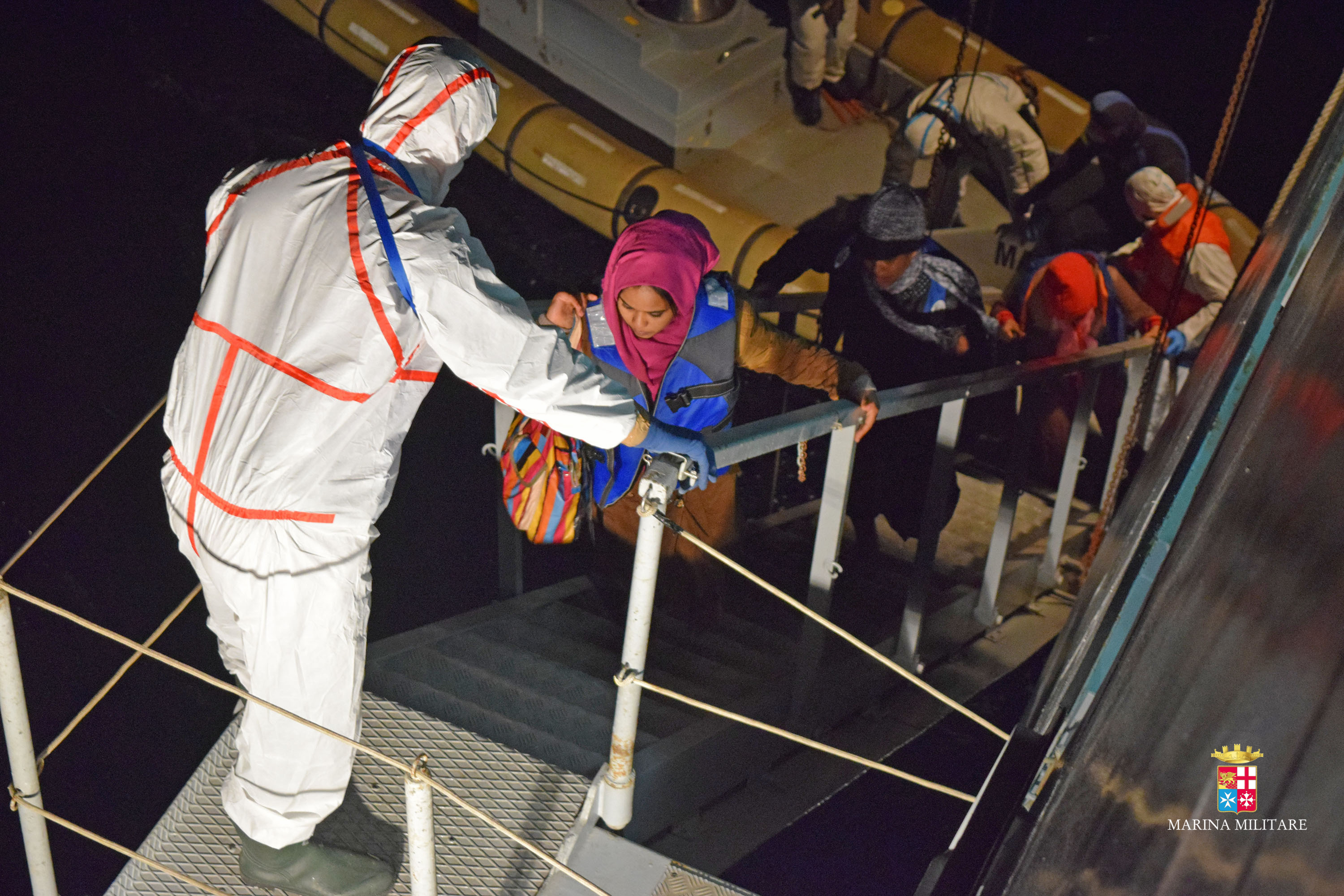 Le navi della Marina Militare hanno permesso anche grazie agli elicotteri imbarcati, un’adeguata cornice di sicurezza a tutti i mezzi coinvolti nelle operazioni di recupero dei naufraghi.