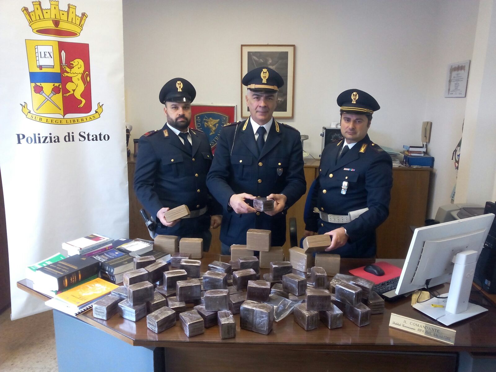 Da una mirata e  minuziosa ispezione dell’autovettura, nel portabagagli posteriore del veicolo è stato rinvenuto un sacco di juta contenente circa 30 Kg. di hashish nascosto dentro ad un rudimentale doppio fondo, opportunamente celato, sotto alcune scatole contenenti pezzi di ricambio di motore; nel vano della ruota di scorta, è stato rinvenuto un altro contenitore di plastica con all’interno circa 10 Kg. di hashish.