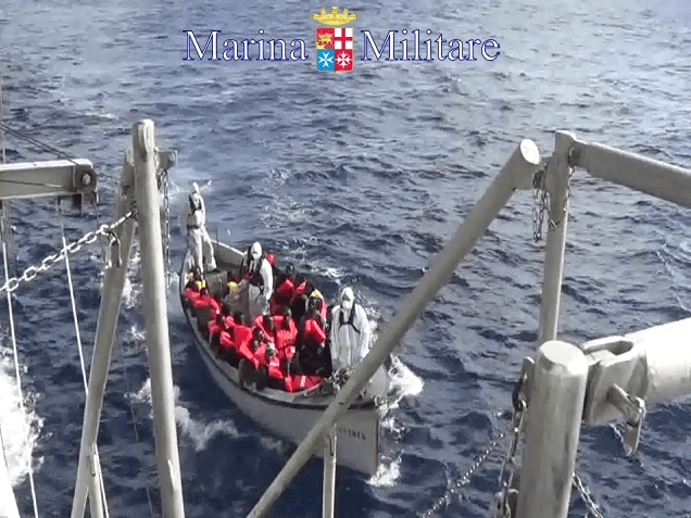 Roma, 13 gennaio 2016 – Nella giornata di oggi la fregata Aliseo e il pattugliatore Spica della Marina Militare, inseriti nel dispositivo Mare Sicuro, hanno individuato e soccorso quattro gommoni in difficoltà, recuperando 453 migranti, di cui 44 minori.