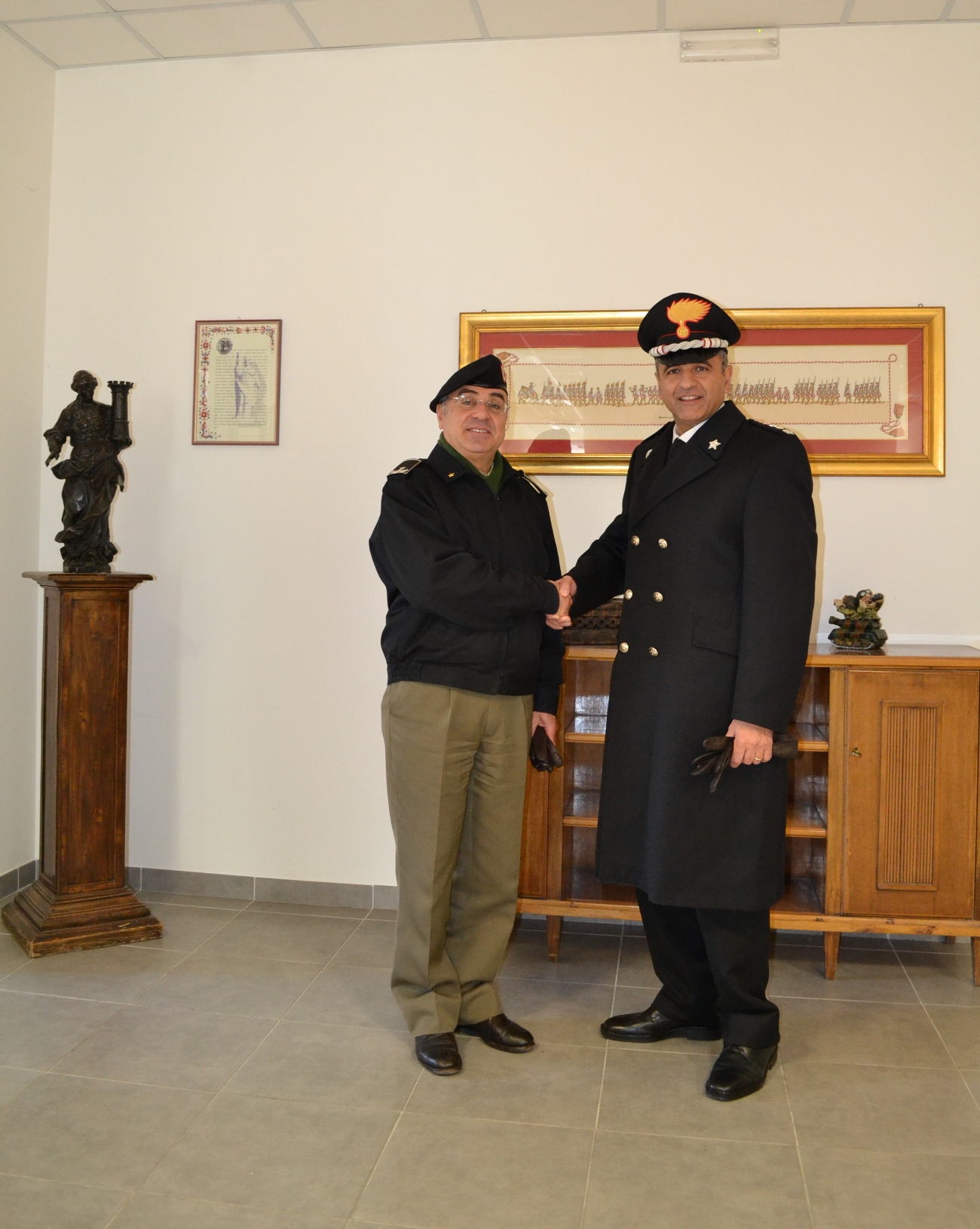 L’Aquila, 20 gennaio 2016 – Questa mattina il comandante militare regionale dell’Esercito per l’Abruzzo, generale di brigata Rino De Vito ha ricevuto la visita di cortesia, presso la sede del suo comando in L’Aquila, del tenente colonnello Antonio Servedio, nuovo comandante del comando provinciale dell’Arma dei Carabinieri dell’Aquila.