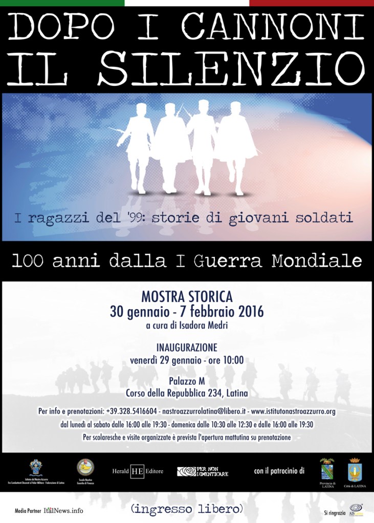 Latina, 24 gennaio 2016 – In occasione del centenario dello scoppio della I Guerra Mondiale, la casa editrice Herald Editore in collaborazione con l’Istituto del Nastro Azzurro – Federazione Provinciale di Latina – e la Scuola Nautica della Guardia di Finanza, promuove la mostra storica “Dopo i Cannoni il Silenzio – I ragazzi del ’99: storie di giovani soldati”