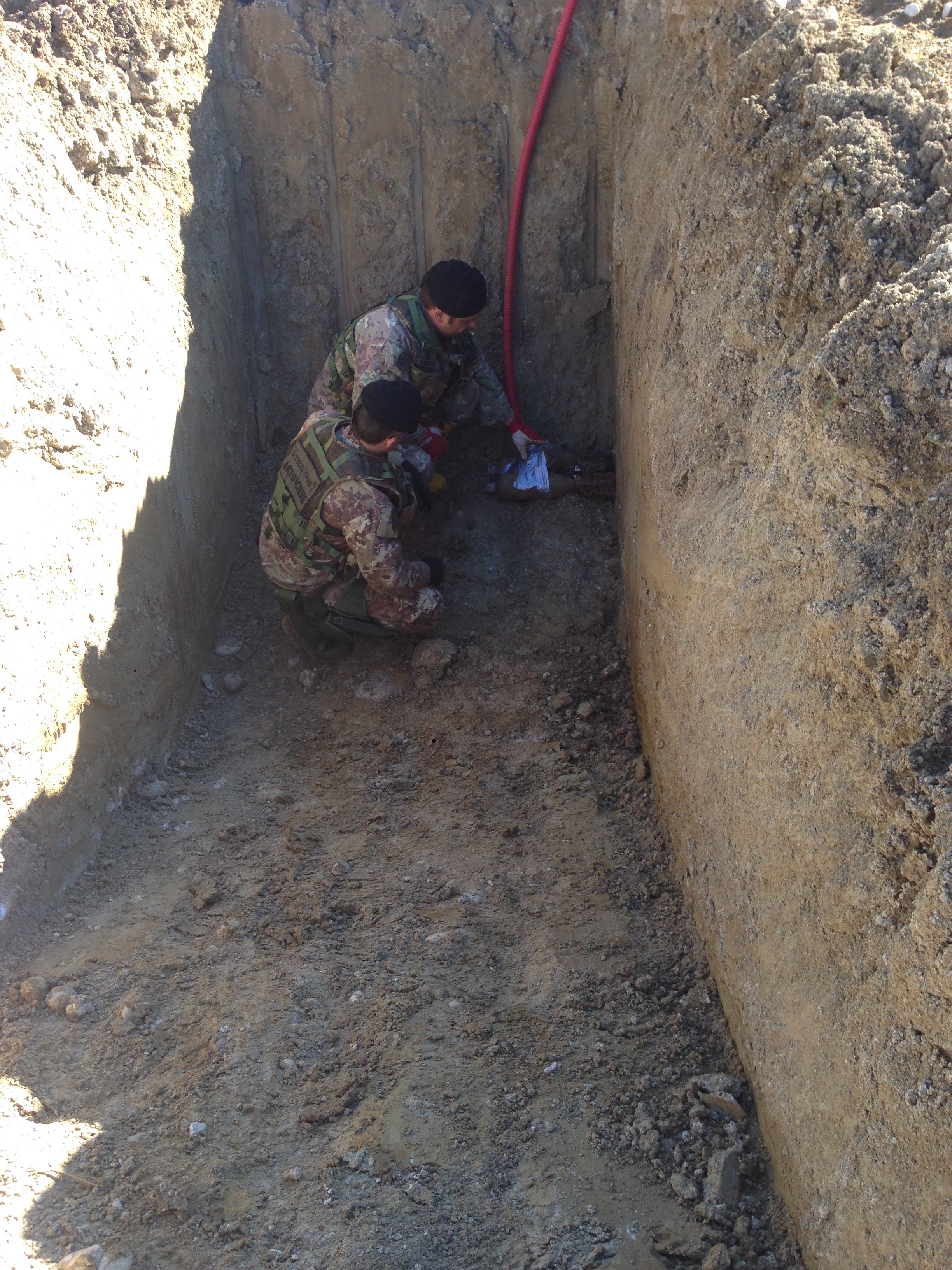 Ortona, 06 febbraio 2016 – Ieri mattina nella cava Marrollo, vicino Fossacesia (CH), sono iniziate le operazioni di scavo e di preparazione del sito, da parte degli artificieri dell’esercito dell’11° reggimento genio di Foggia, dove oggi sono state fatte brillate 4 bombe da mortaio inglesi.