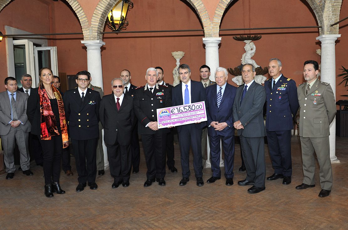 Roma, 21 aprile 2016 – È stato consegnato oggi il ricavato della manifestazione “Natale con le Forze Armate a Rainbow Magicland”, organizzata dallo Stato Maggiore della Difesa e dalla direzione del parco, agli enti morali di assistenza dei familiari del personale dell’Esercito, della Marina, dell’Aeronautica e dei Carabinieri.