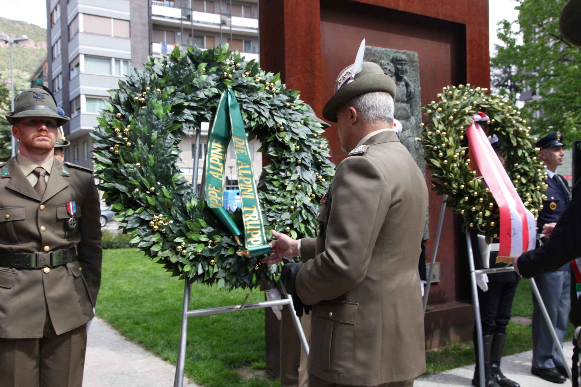 Bolzano, 25 aprile 2016 – Stamani, in occasione della ricorrenza del 71° anniversario della Liberazione, il comandante delle Truppe Alpine, generale Federico Bonato, accompagnato dalle massime autorità cittadine ha reso gli onori ai caduti per la Patria, la libertà e la pace con diverse cerimonie rese solenni dalla presenza di un picchetto in armi del Reparto Comando e Supporti Tattici “Tridentina” e delle rappresentanze delle associazioni combattentistiche e d’arma, intervenute con i loro labari e gagliardetti.