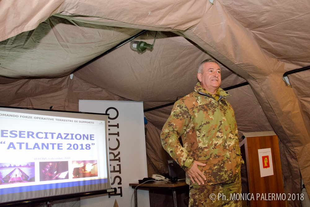 Verona, 9 dicembre 2018 – Termina l’esercitazione Atlante 2018 con un media day organizzato il 7 dicembre dal generale di corpo d’armata Giuseppenicola Tota, comandante delle Forze Operative Terrestri di Supporto (COMFOTER SPT), presso il Centro Polifunzionale Manuel Fiorito di Verona. L’esercitazione, svolta dal 19 novembre sino al 7 dicembre, ha visto impegnati 1589 donne e uomini dell’Esercito con l’impiego di 665 mezzi.
