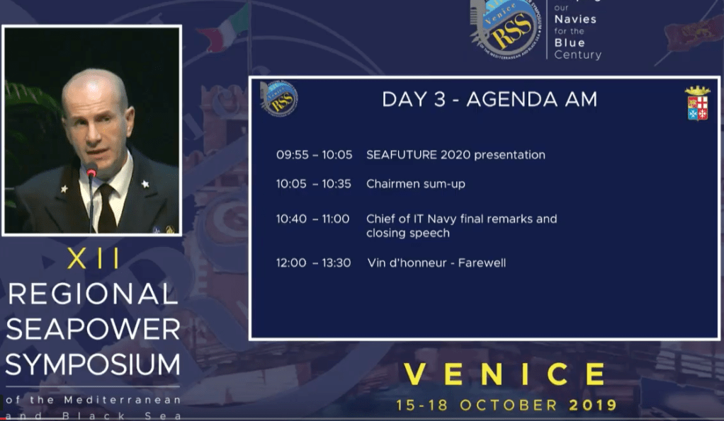 Venezia, 18 ottobre 2019 – Altra giornata ricca di interventi e attività per l’ultima giornata del Simposio, a cui stanno partecipando circa 60 Marine mondiali di cui 34 rappresentate dai capi di Stato Maggiore. I partecipanti, collegati tutti in wi-fi, possono fruire di audio con traduzione simultanea in diverse lingue: inglese, italiano, francese, spagnolo, arabo, portoghese, cinese e russo. Qualora la lingua parlata sia diversa dall’inglese la traduzione avviene solo in inglese.
