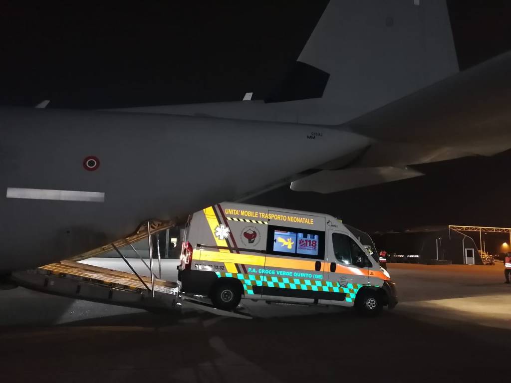 La seconda richiesta, giunta quasi contemporaneamente dalla Prefettura di Padova, è quella relativa ad un bimbo di 10 mesi bisognoso di trasporto in una speciale ambulanza che consente il trattamento in modalità ECMO (Extra Corporeal Membrane Oxygenation – Ossigenazione Extracorporea a Membrana). Il Comando Operazioni Aeree di Poggio Renatico ha allertato la 46ª Brigata Aerea di Pisa dove un C-130J, unico velivolo in grado di assicurare questo tipo di trasporto tramite l’imbarco dell’ambulanza specializzata, si è alzato in volo diretto a Padova. Da qui, il C-130J è nuovamente decollato alla volta di Genova dove il bimbo, sotto stretta osservazione del personale medico al seguito, è stata trasportato in ambulanza all’Ospedale Gaslini di Genova per ricevere le cure necessarie.