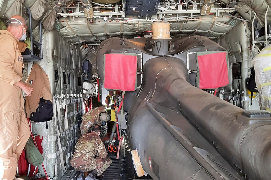 Un’operazione di estrema precisione che prevede il riassemblaggio dei numerosi componenti che erano stati precedentemente smontati per permettere all’elicottero di raggiungere le sue dimensioni minime al fine di permettere il caricamento a bordo dell’aereo.