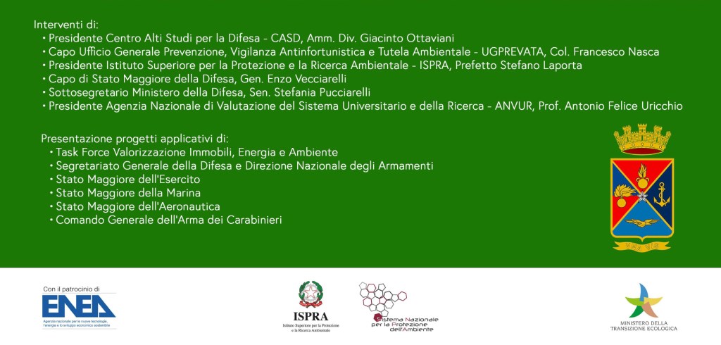 Al convegno, trasmesso in diretta sui social, sono intervenuti il sottosegretario di Stato alla Difesa Sen. Stefania Pucciarelli, il capo di SMD generale Enzo Vecciarelli, il presidente dell’ISPRA, prefetto Stefano Laporta e il presidente dell’ANVUR, professor Antonio Felice Uricchio e il capo dell’UGPREVATA, colonnello Francesco Nasca, ideatore e organizzatore dell’evento.