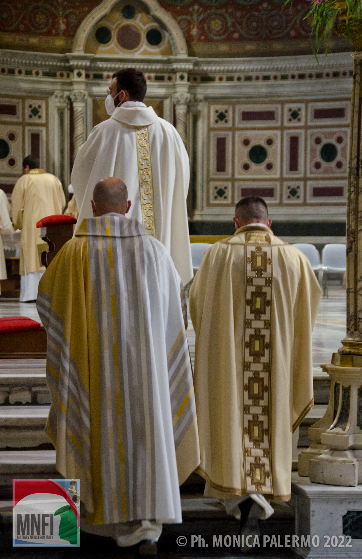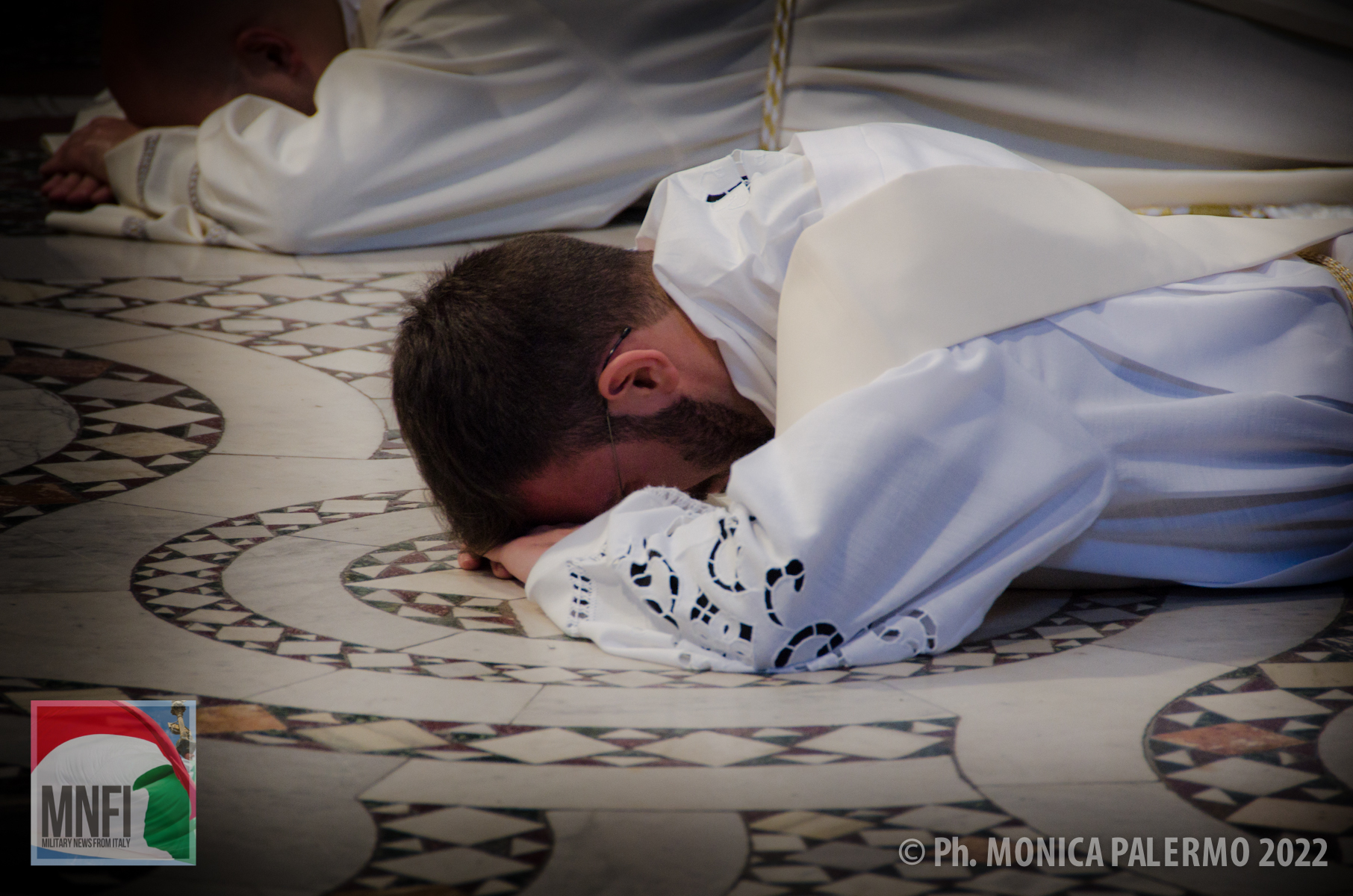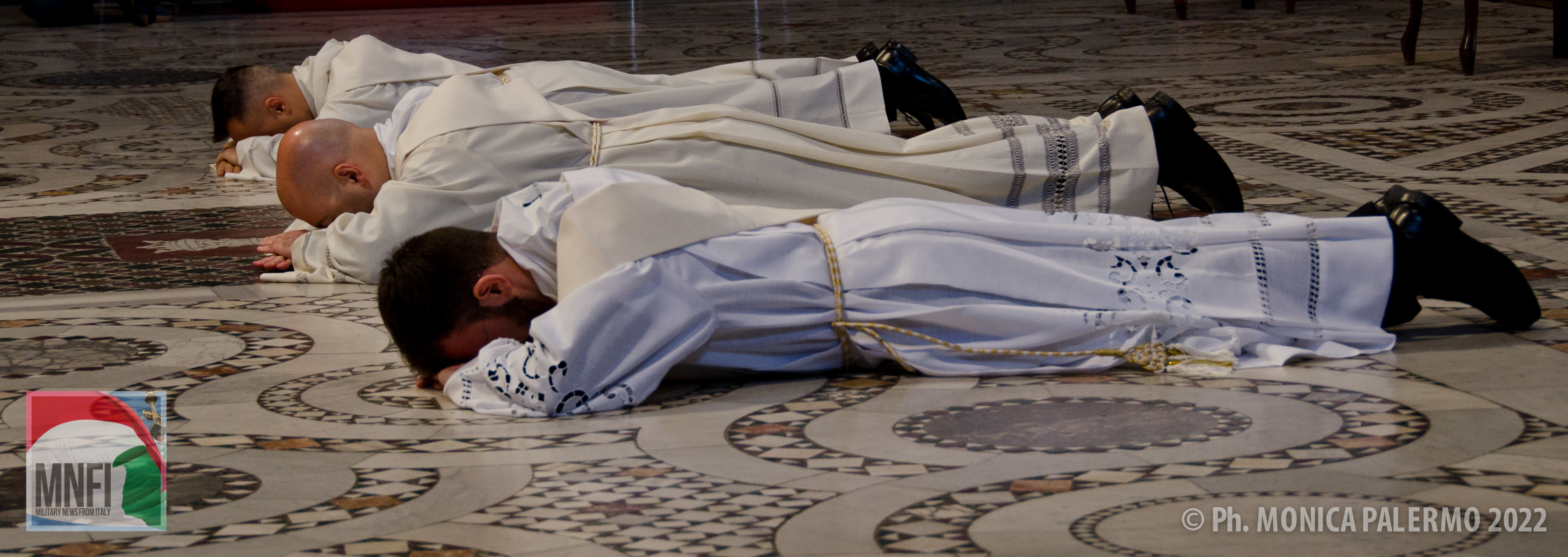 Roma, 17 maggio 2022 – (di Christian Massaro) La Chiesa Militare, nei primi vespri della IV domenica di Pasqua, detta del Buon Pastore, ha accolto come presbiteri don Luigi Benemerito, don Valerio Carluccio e don Giuseppe Massaro, giovani che, attratti dall’amore del Signore, hanno deciso di seguirlo per diventare suoi annunciatori dedicandosi in particolare agli uomini e alle donne con le stellette. La celebrazione è stata presieduta dall’Ordinario Militare, mons. Santo Marcianò e concelebrata da mons. Daniele Libanori, vescovo ausiliare di Roma e da un centinaio di sacerdoti, cappellani militari e amici dei tre eletti. Ha assistito alla messa mons. Luca Brandolini, vicario dell’arciprete della Basilica di San Giovanni in Laterano che ha ospitato la liturgia di ordinazione.