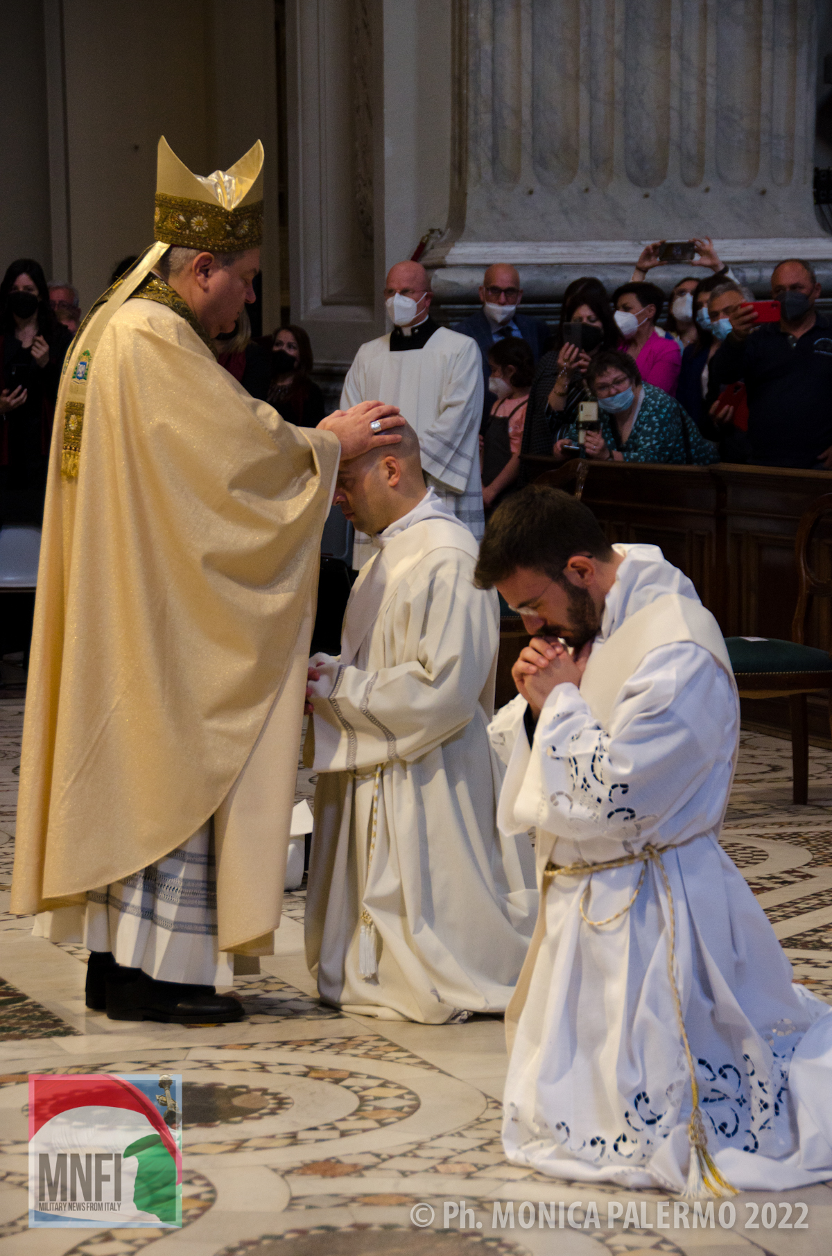 La celebrazione è proseguita con l’interrogazione dei candidati, che si sono liberamente assunti gli impegni del presbiterato e, nelle mani dell’Arcivescovo, hanno promesso a lui ed ai suoi successori filiale rispetto e obbedienza. Il canto delle litanie con la prostrazione dei tre diaconi ha preceduto l’imposizione delle mani da parte del vescovo e dei presbiteri presenti e la grande preghiera consacratoria per la quale Luigi Valerio e Giuseppe sono diventati sacerdoti della Chiesa di Dio.