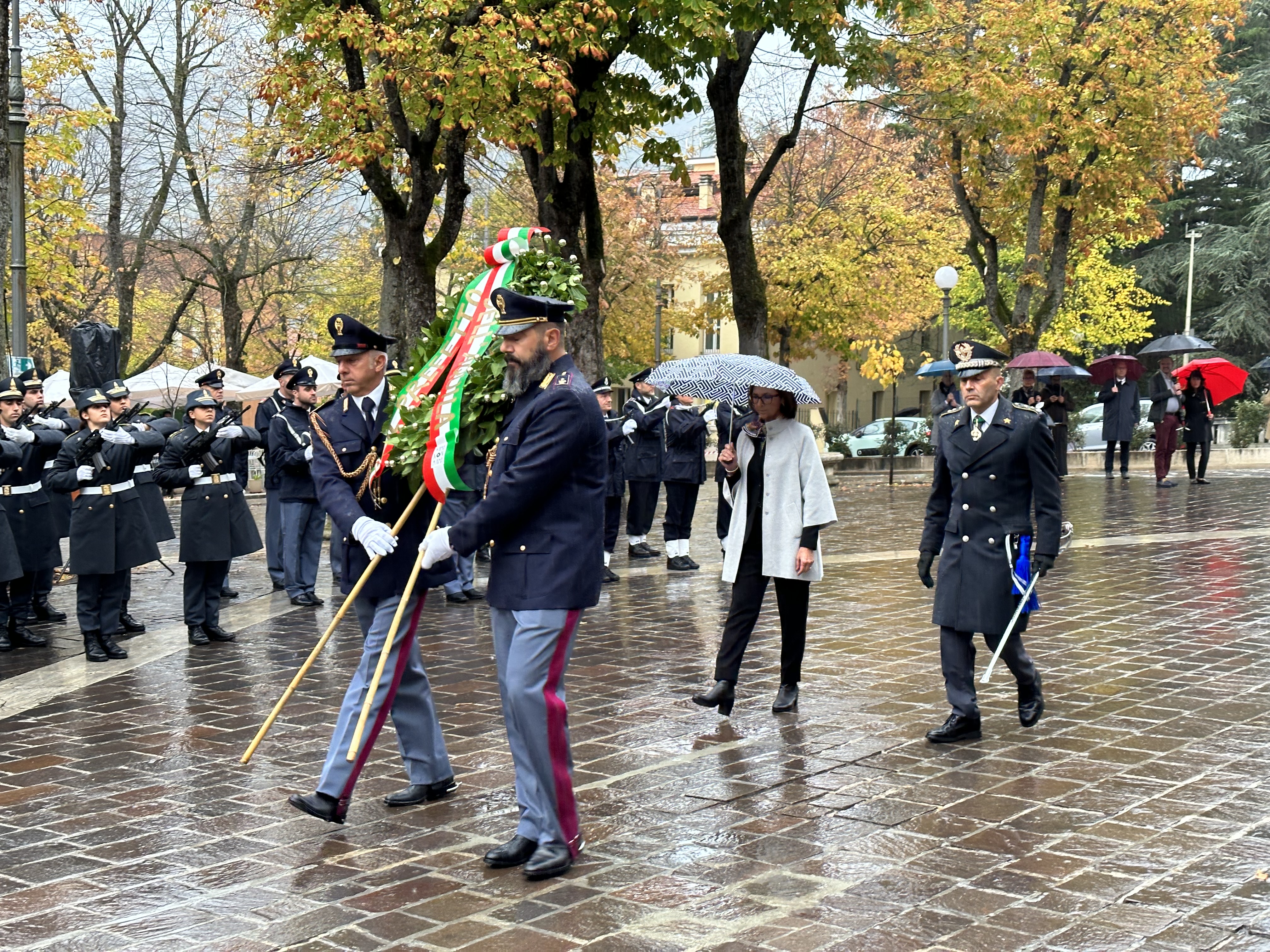La celebrazione nel capoluogo abruzzese ha avuto inizio presso la Villa Comunale dove un picchetto interforze, in armi, composto da Esercito, Carabinieri, Guardia di Finanza, Polizia di Stato e Polizia Penitenziaria, ha reso gli Onori ai Caduti, con la deposizione, da parte del prefetto della città de L’Aquila, dott.ssa Cinzia Teresa Torraco, e del comandante regionale Abruzzo della Guardia di Finanza, generale di divisione Gianluigi D’Alfonso, di una corona d’alloro al Monumento ai Caduti.