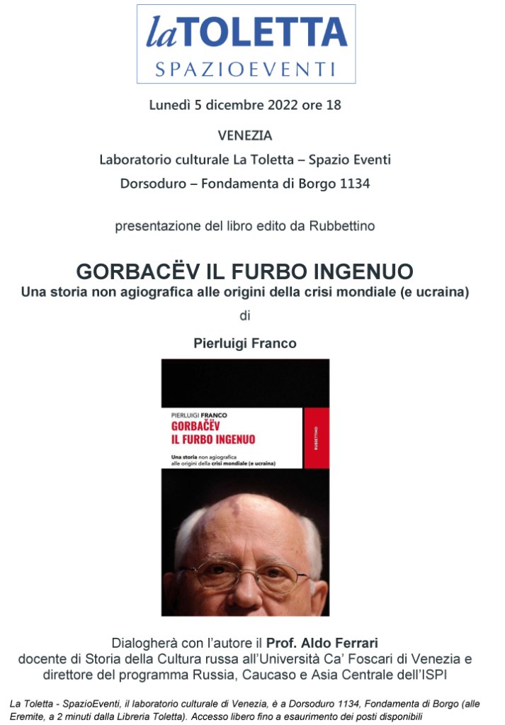 Venezia, 28 novembre 2022 – Il libro “Gorbacëv il furbo ingenuo” di Pierluigi Franco, edito da Rubbettino Editore, verrà presentato il 5 dicembre a Venezia presso La Toletta – SpazioEventi.