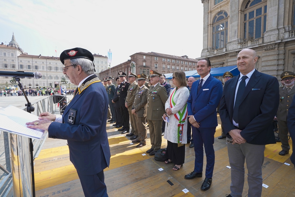 La cerimonia militare si è tenuta in Piazza Castello dove, fra gli altri, erano schierati il Medagliere Nazionale A.N.Art.I., la Bandiera di Guerra dell’Arma Artiglieria, quella del 185° reggimento Artiglieria Paracadutisti “Folgore”, e ai gonfaloni delle Città di Torino, Asti e Biella, decorati di Medaglia d’Oro al Valor Militare.