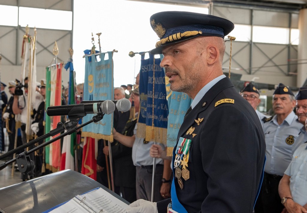 Il generale Frigerio ha poi rivolto un sentito augurio al nuovo comandante, il colonnello Fiorini, sottolineando che il cambio al comando porta nuova energia e vitalità, frutto delle diverse esperienze vissute dai comandanti che si succedono, esprimendo fiducia verso il col. Fiorini, che saprà svolgere un’azione di comando attenta, pragmatica e intelligente, consegnandogli simbolicamente le insegne di Comando e le tradizioni dello Stormo attraverso il passaggio della Bandiera.