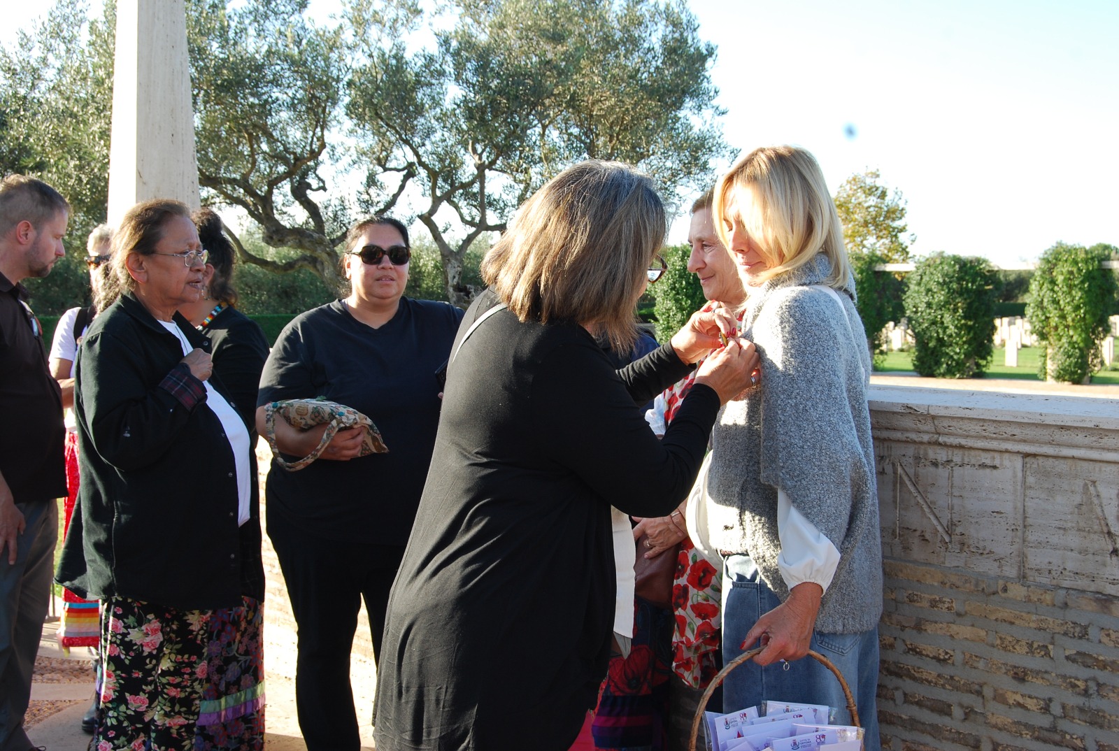 Insieme all’ambasciatrice Elissa Golberg, erano presenti il vice comandante del comando interforze alleato di Napoli, tenente generale canadese Stephen Kelsey, il colonnello onorario (rit) delle Prime Nazioni John Newman, il tenente colonnello Sasha Darling del 48esimo reggimento Highlanders del Canada e per la prima volta, una delegazione di donne Ojibway discendenti dei veterani indigeni che hanno combattuto nella campagna d’Italia.