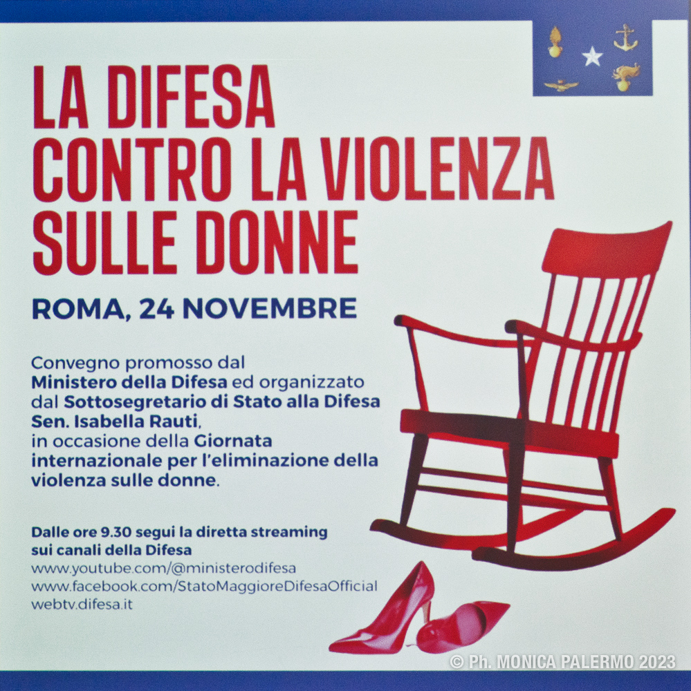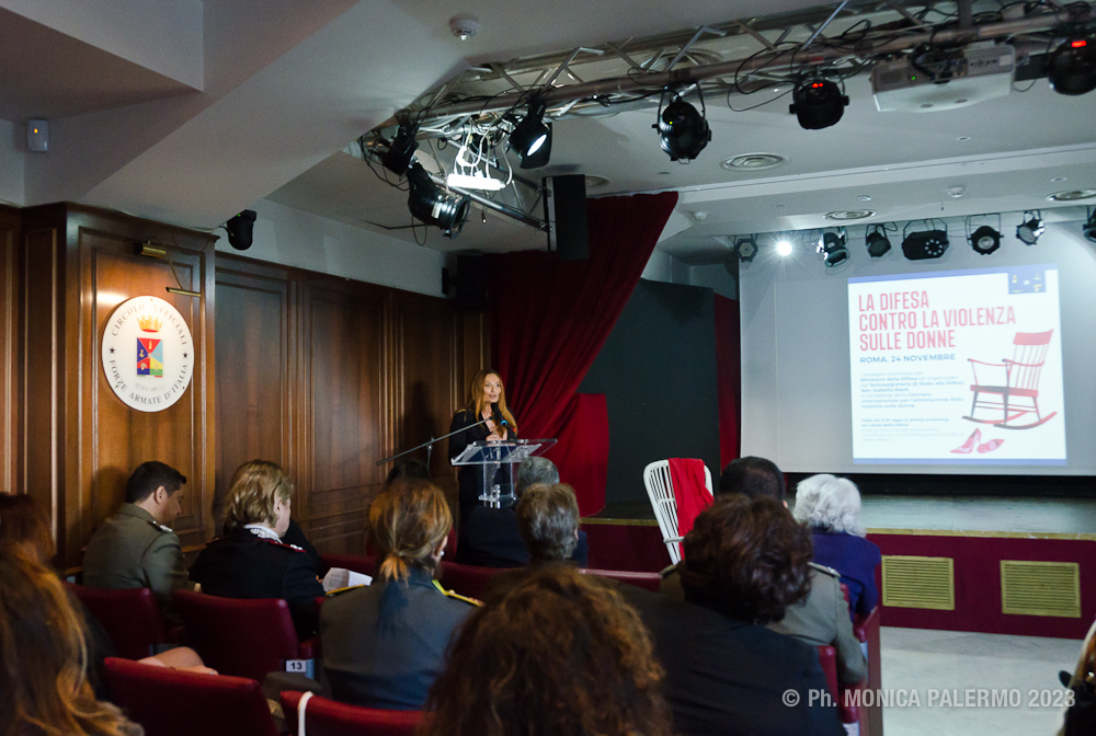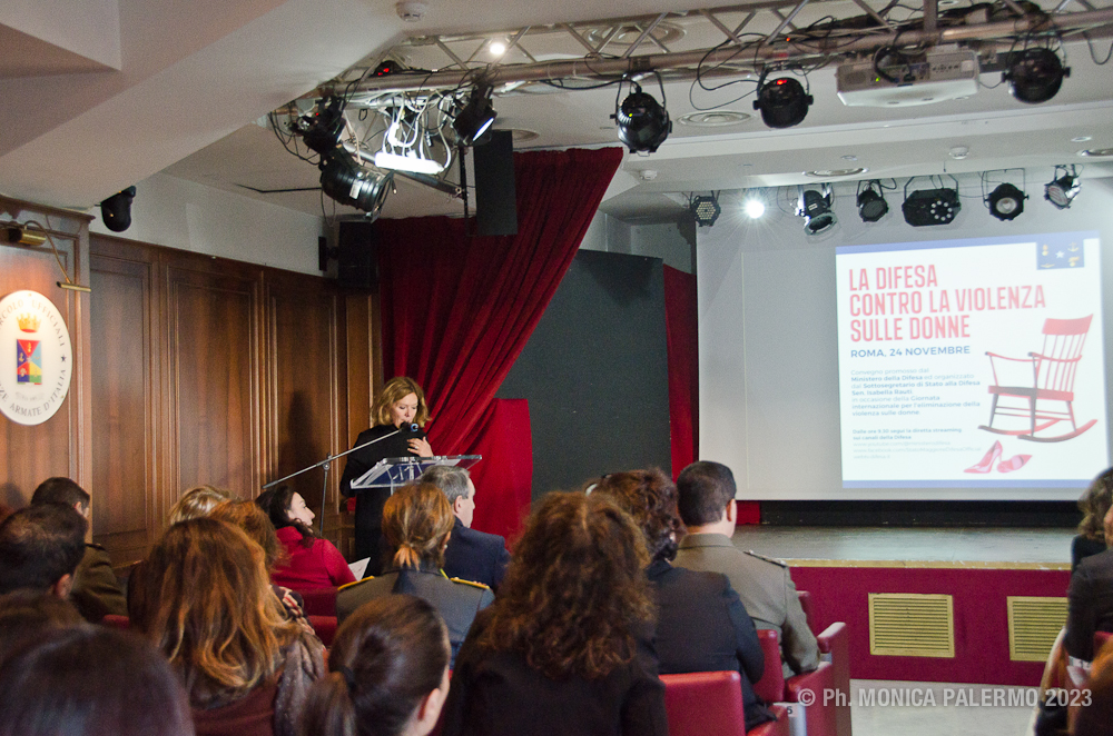 La senatrice Rauti, sottosegretario di Stato alla Difesa, con delega alla promozione delle politiche di parità di genere e di pari opportunità, nel suo intervento iniziale ha evidenziato che: “Il Ministero della Difesa è in prima linea sulla prevenzione e sul contrasto della violenza contro le donne e l’evento di oggi rappresenta un’occasione per riflettere su un fenomeno antico, in questi giorni molto attenzionato ma troppo spesso sottovalutato. Ciò che emerge è la punta dell’iceberg di un sommerso che attraversa il mondo, le geografie, le religioni, le società, i secoli, la Storia. Il suo contrasto è una battaglia di civiltà infinita, da continuare senza sosta, e a tutti i livelli, normativo, culturale, sociale ed educativo. Il disegno di legge 923 approvato all’unanimità due giorni fa in Senato è un concreto passo in avanti nella battaglia alle violenze di genere, con un rafforzamento delle misure di protezione delle vittime e dei sistemi di prevenzione, nonché il potenziamento delle misure cautelari”.
