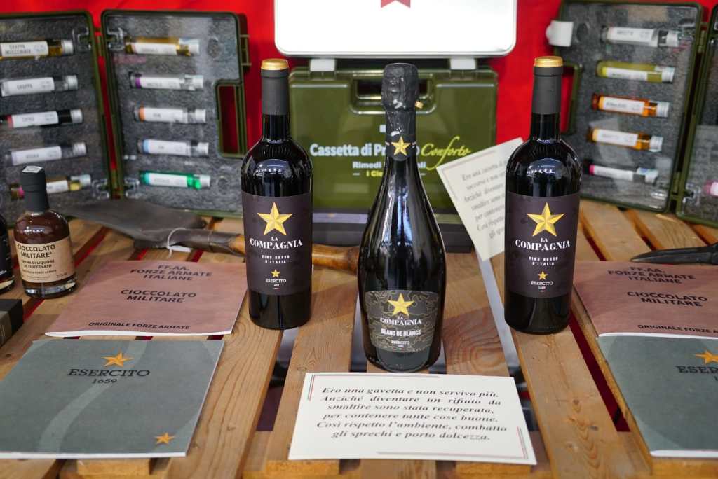 Tra i vini proposti vi è il “Rosso d’Italia – La Compagnia” delle Tenute Piccini, un blend di uve rosse provenienti da diverse regioni italiane, e il vino Dimonios di Sella&Mosca, legato alla Brigata “Sassari” dell’Esercito Italiano, ottenuto da uve cannonau raccolte in Sardegna.