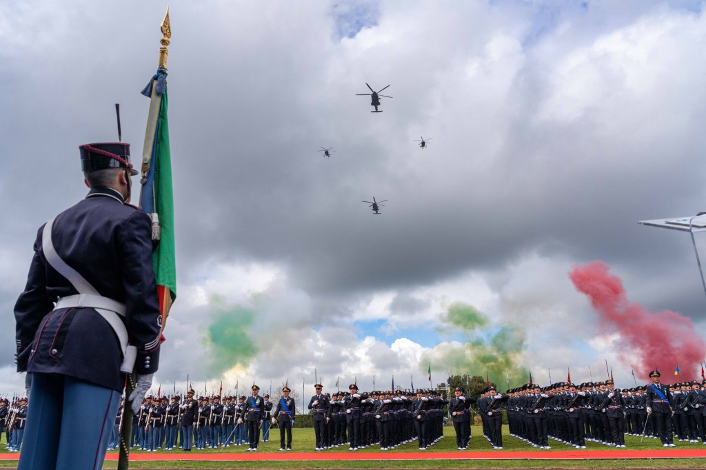 Il momento del giuramento è stato sottolineato dal deciso e corale “Lo giuro” da parte degli Allievi Marescialli, e reso ancora più suggestivo dal sorvolo di una formazione di elicotteri TH-500 ed HH-139 dell’Aeronautica Militare e da una salva d’artiglieria tricolore.