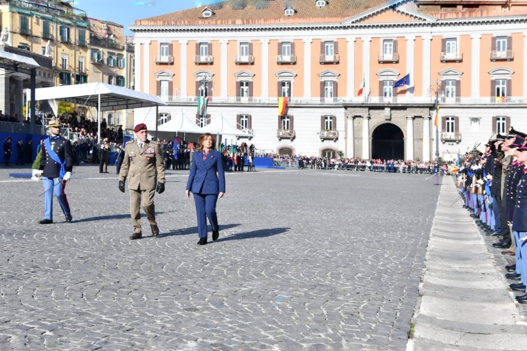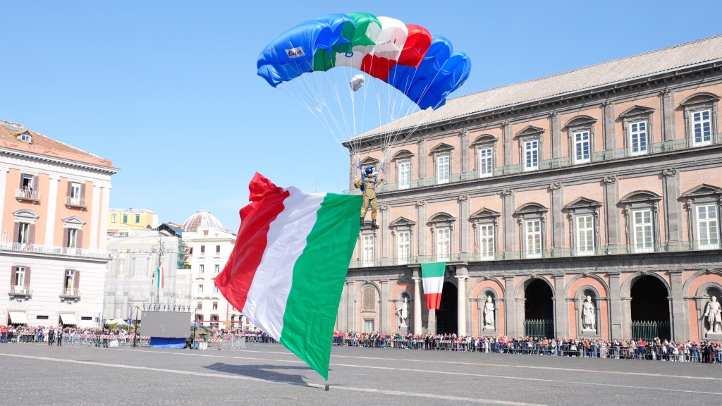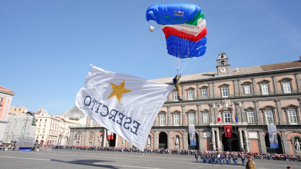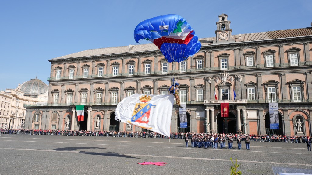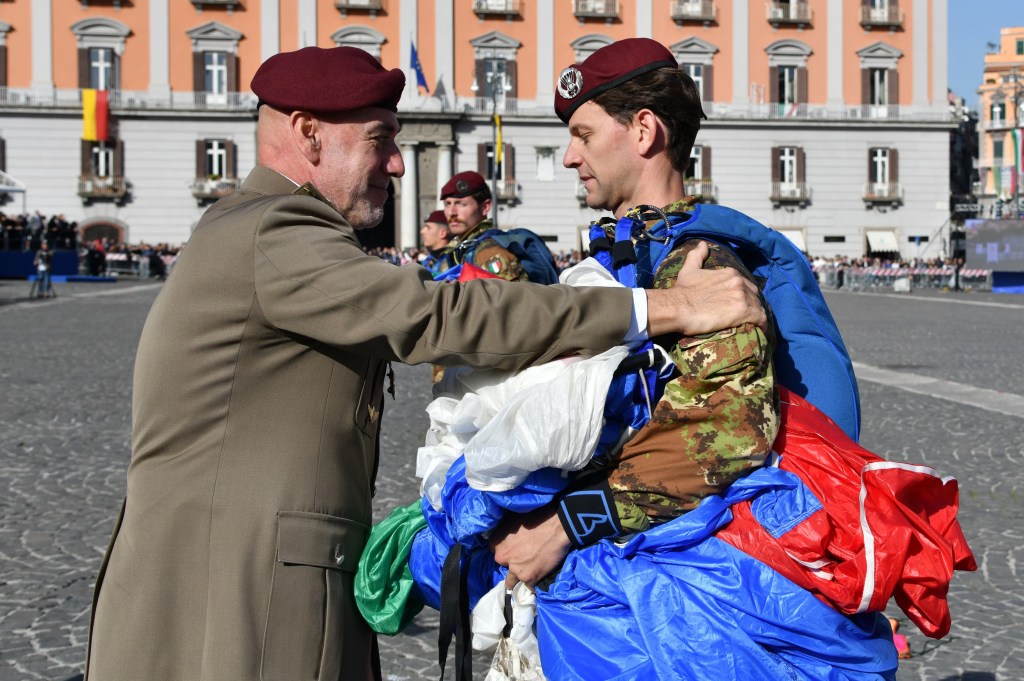 I paracadutisti dell’Esercito Italiano sono atterrati in Piazza del Plebiscito al termine della cerimonia, sventolando il Tricolore nel cielo di Napoli tra la partecipazione entusiasta dei presenti.